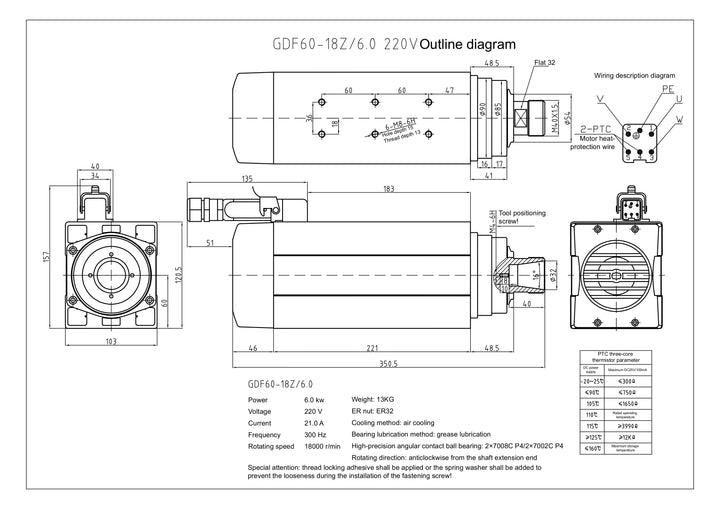 - 1 x HQD 6.0 KW Spindle Motor (GDF60-18Z/6.0 KW)