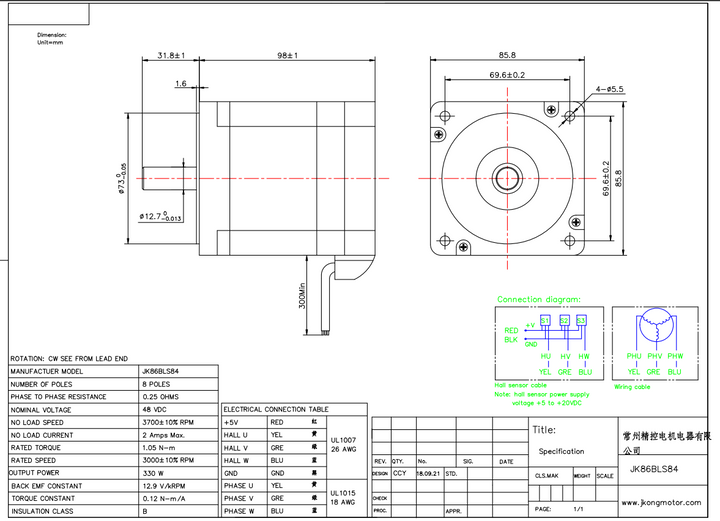 JK86BLS84 Brushless Motor 330 Watt BLDC
