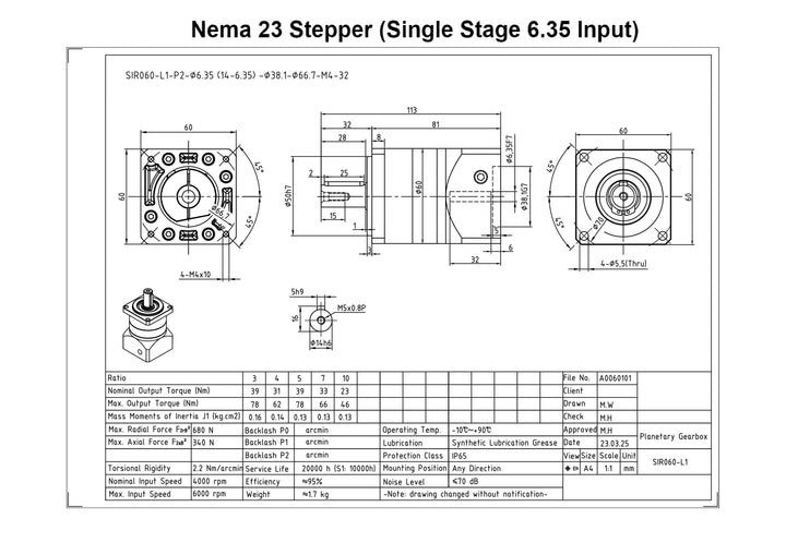- 1 x NEMA 23 Planetary Gearbox (SIR060-10A-6.35-OW)