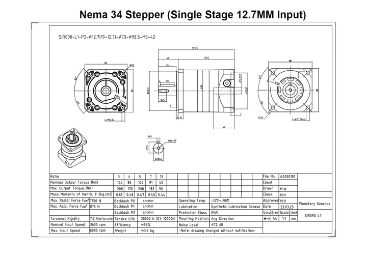- 1 x NEMA 34 Planetary Gearbox (SIR090-5A-12.7-OW)