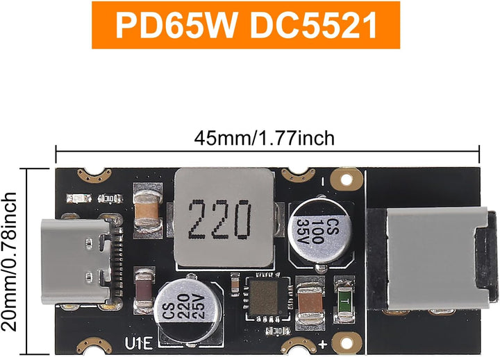 The PD65W Fast Charging Adapter Module with DC5521 Connector is a compact and highly efficient charging solution tailored for USB-C-powered devices. Featuring Power Delivery (PD) 3.1 technology, it delivers up to 65W of fast, reliable power, making it ideal for smartphones, tablets, laptops, and other portable electronics.