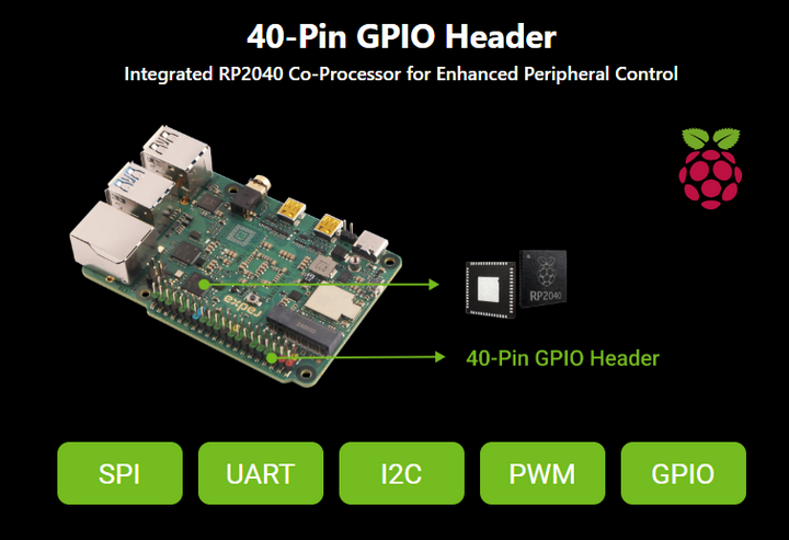 - 40-Pin GPIO Header: Offers versatile connectivity options with support for SPI, UART, I2C, PWM, and more, powered by the RP2040.